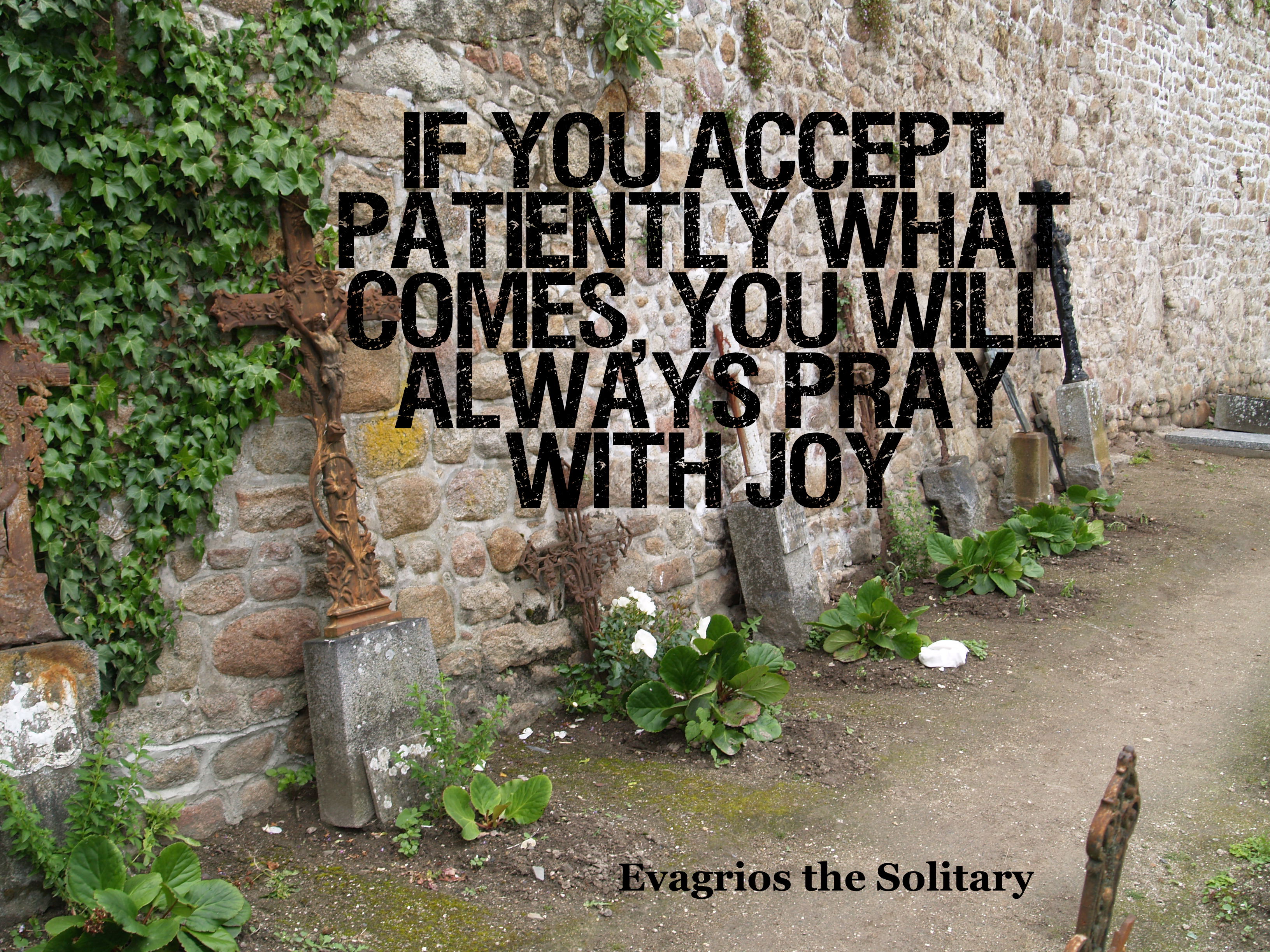 patient acceptance Leave a comment February 12, 2015 nourishinggrace “If you accept patiently what comes, you will always pray with joy.” ~ Evagrios the Solitary Share this: Click to share on X (Opens in new window) X Click to share on Facebook (Opens in new window) Facebook Like Loading... Related