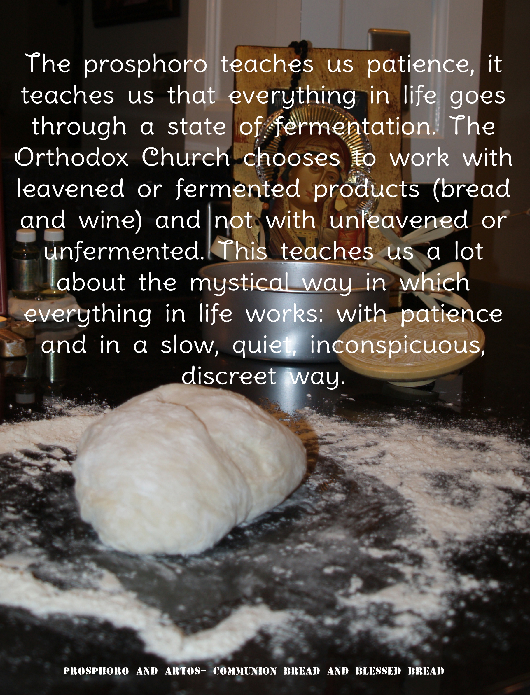 “The prosphoro teaches us patience. It teaches us that everything in life goes through a state of fermentation. The Orthodox Church chooses to work with fermented products – bread and wine – and not with unleavened or unfermented. This teaches us a lot about the mystical way in which everything in life works : with patience and in a slow, quiet, inconspicuous, discreet way.”