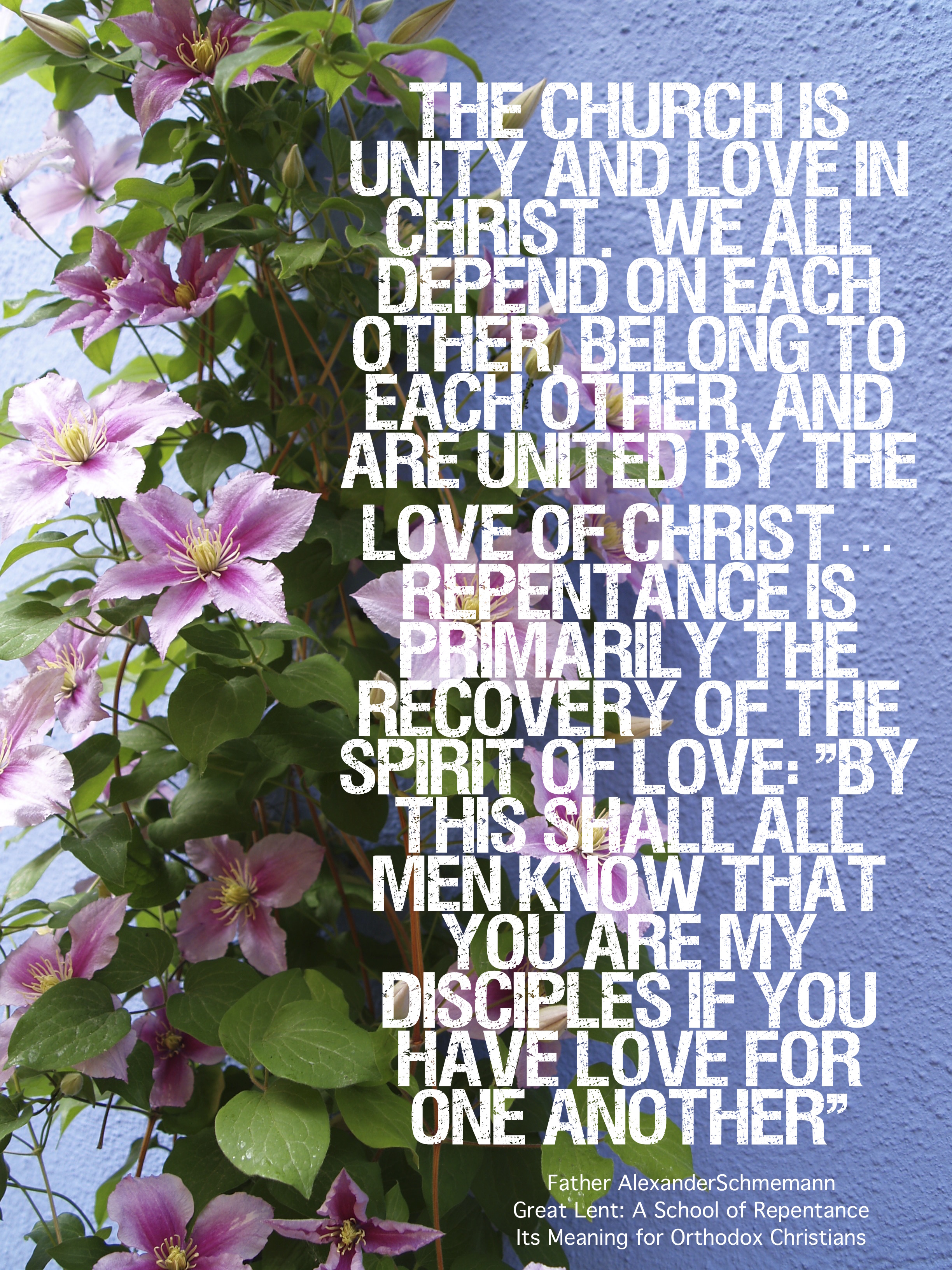 “The Church is unity and love in Christ. We all depend on each other, belong to each other, are united by the love of Christ… Repentance is primarily the recovery of the spirit of love: “By this shall all men know that you are my disciples if you have love for one another”