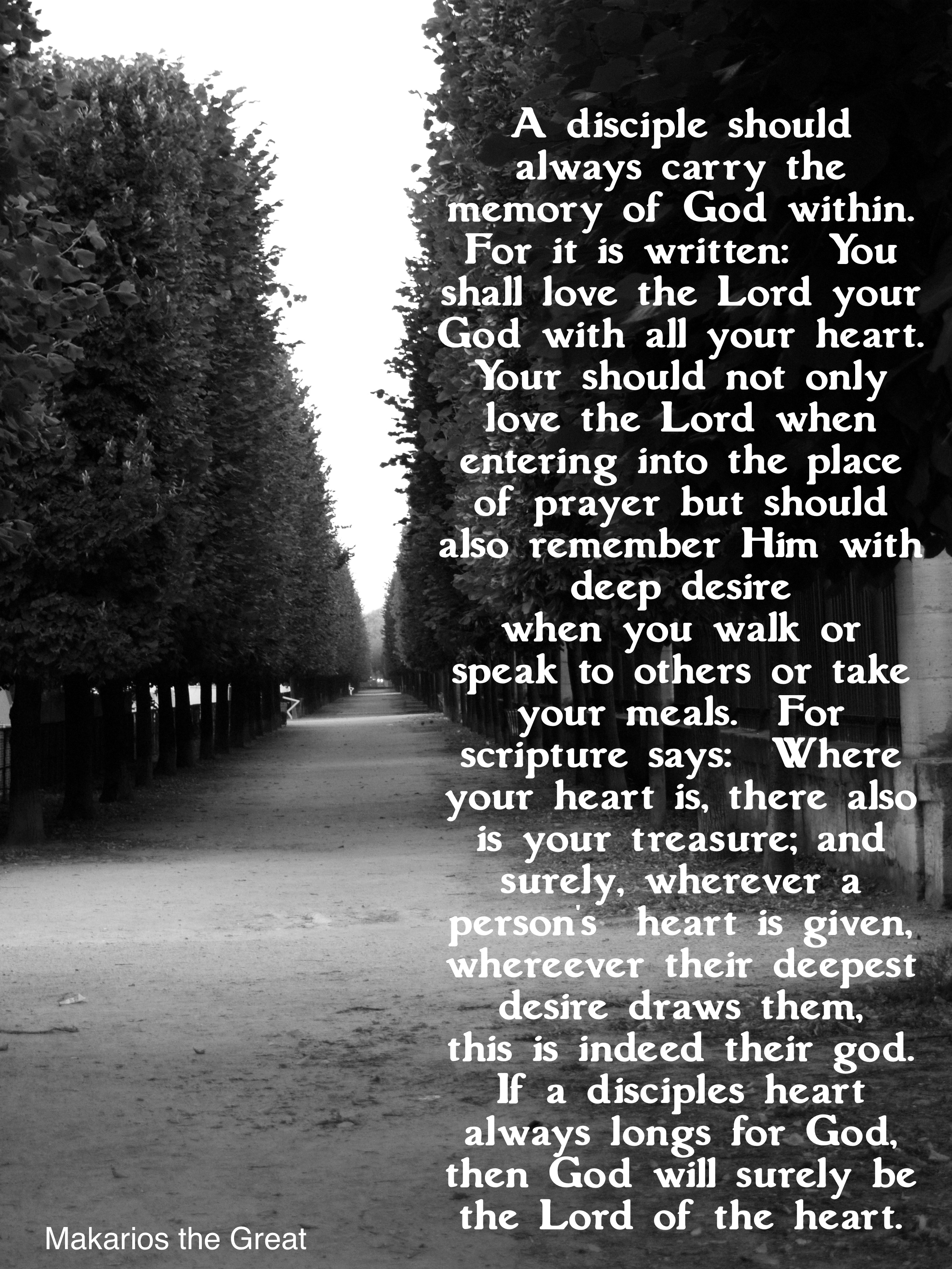 A disciple should always carry the memory of God within. For it is written: You shall love the Lord your God with all your heart. Your should not only love the Lord when entering into the place of prayer but should also remember Him with deep desire when you walk or speak to others or take your meals. For scripture says: Where your heart is, there also is your treasure; and surely, wherever a person’s heart is given, where ever their deepest desire draws them, this is indeed their god. If a disciple’s heart always longs for God, then God will surely be the Lord of the heart.