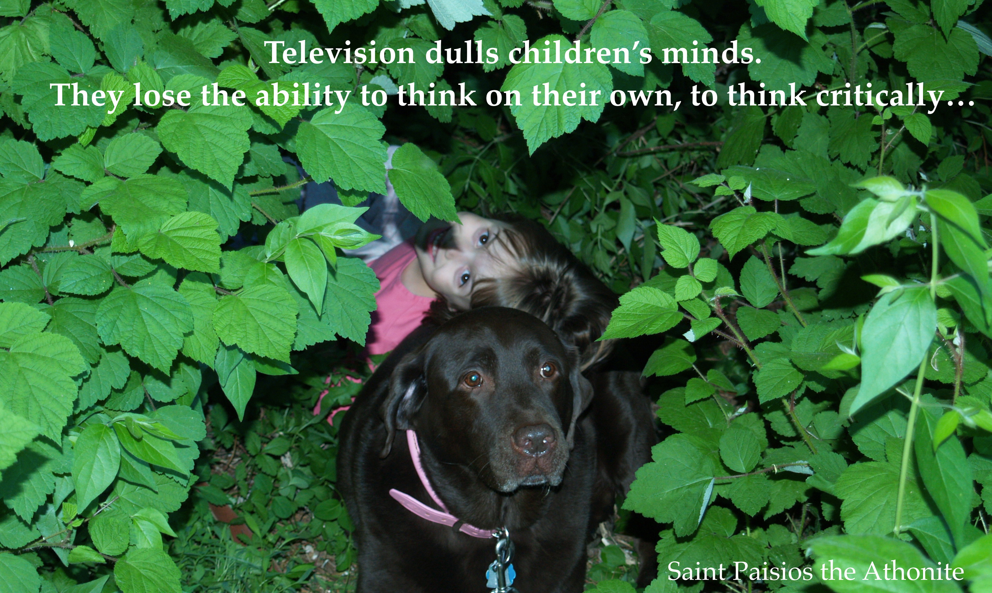 outside air Leave a comment May 26, 2015 nourishinggrace Television dulls children’s minds. They lose the ability to think on their own, to think critically… Television has done us great damage. Saint Paisios the Athonite Share this: Click to share on X (Opens in new window) X Click to share on Facebook (Opens in new window) Facebook Like Loading... Related