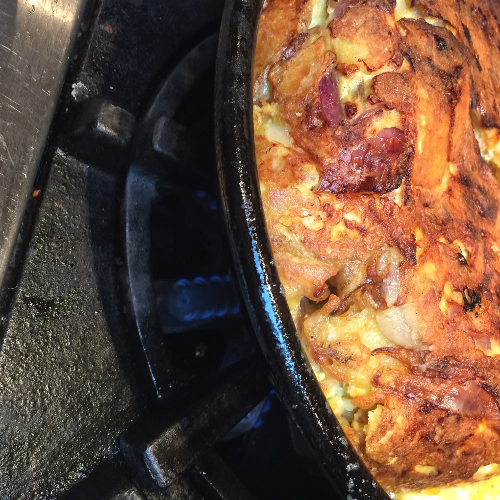 This potato gallette is a really easy weeknight meal. It’s savory with a hint of herbs from the garden. Our egg yolks are so absolutely vibrantly orange (like the old fashioned red orange crayola color) it’s abundantly clear they are packed with choline, folate, vitamin A, vitamin E, tons of beta-carotene and plenty of omega-3 fats from the flax we feed them and the free range forage they enjoy. If your interested in how the life and diet of a hen reflect in the nutrient content of her eggs, check out these results from Mother Earth News.