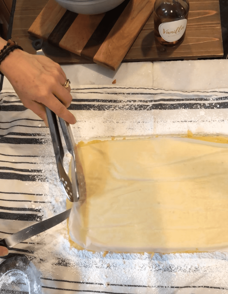 - While the cake is baking, take a kitchen towel and generously sprinkle with powdered sugar. This is an important step and it helps the cake not stick to the towel. Flip the cake over the towel. Remove the parchment paper and dust the top of the cake with powdered sugar.